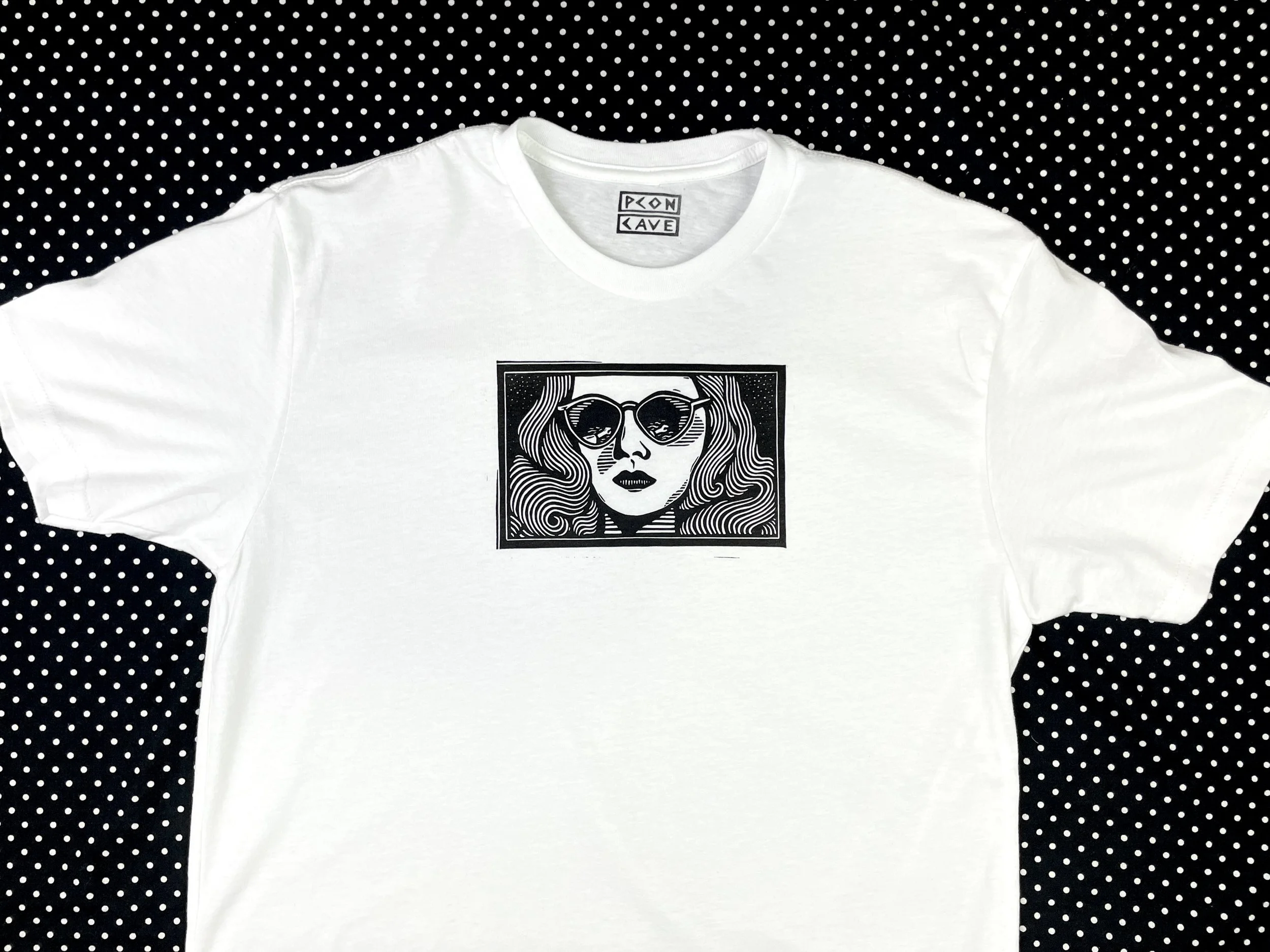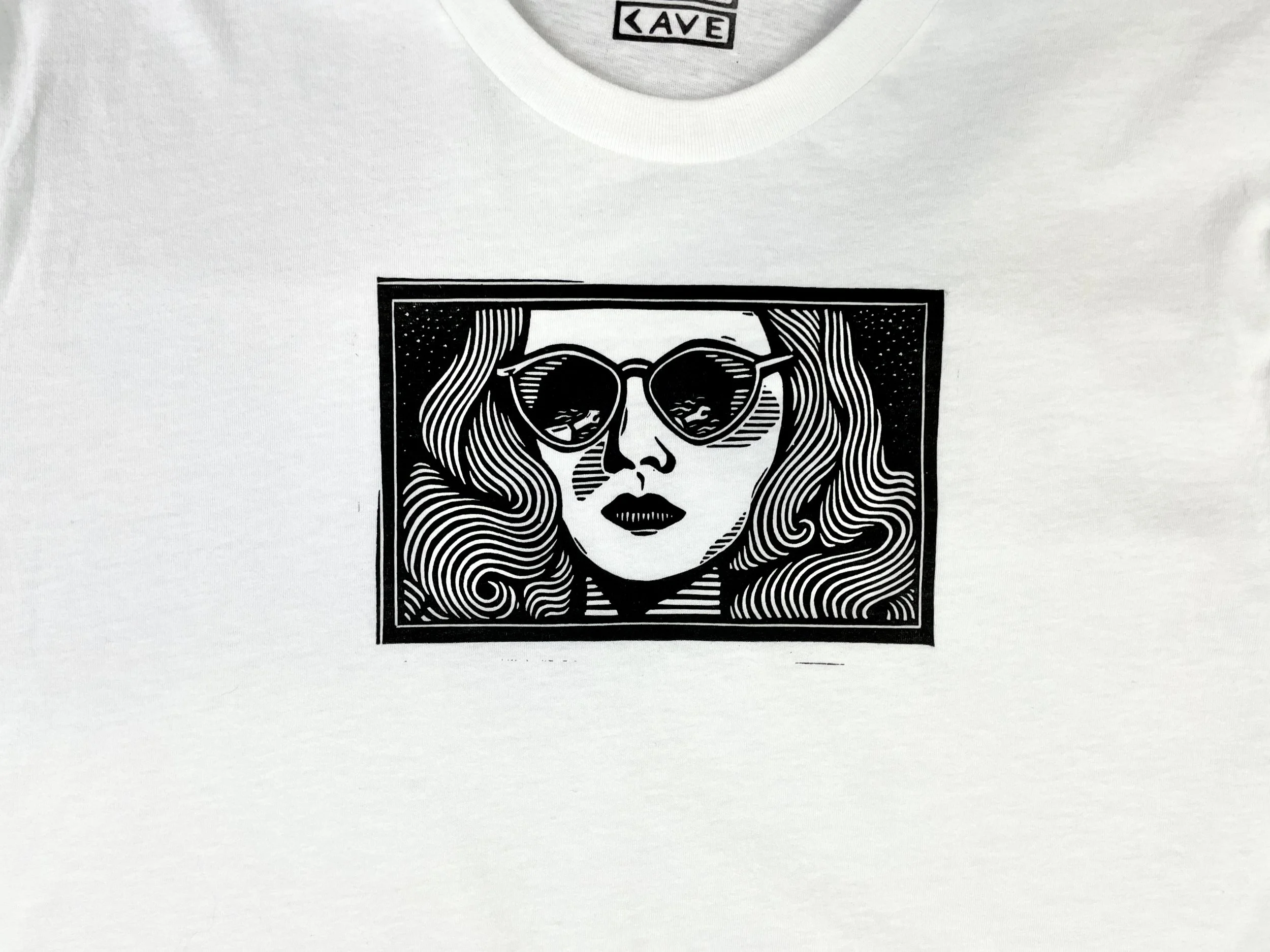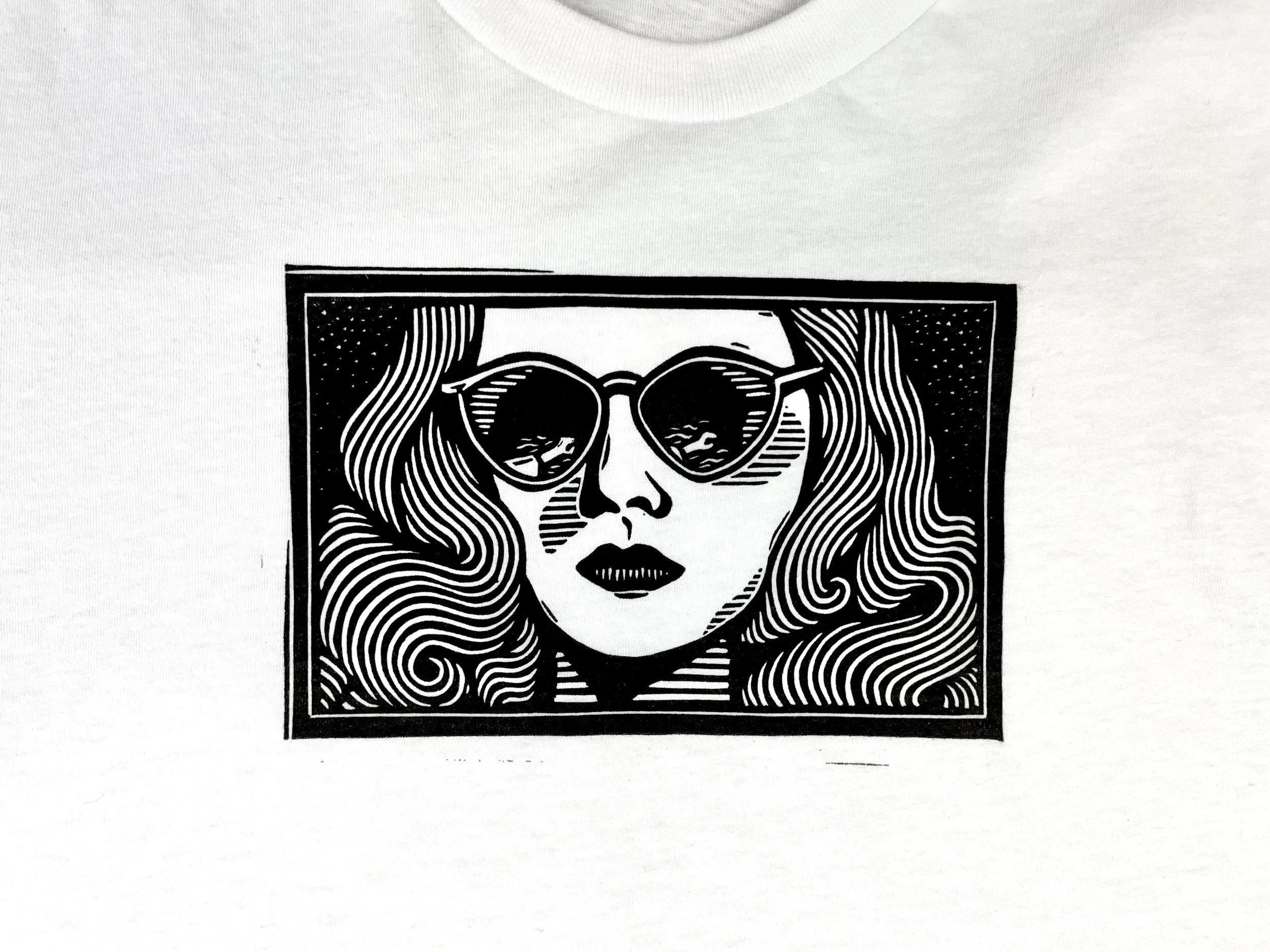 I LOVE the smell of commerce in the morning 57 Biscayne - Linocut printed t shirt $35.00 Gene Tierney - Leave Her To Heaven - Linocut - Block Print T Shirt $35.00 Film Noir - Sign Language - Smoking - Linocut Block Print T Shirt $35.00